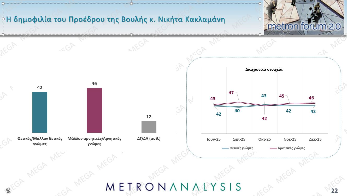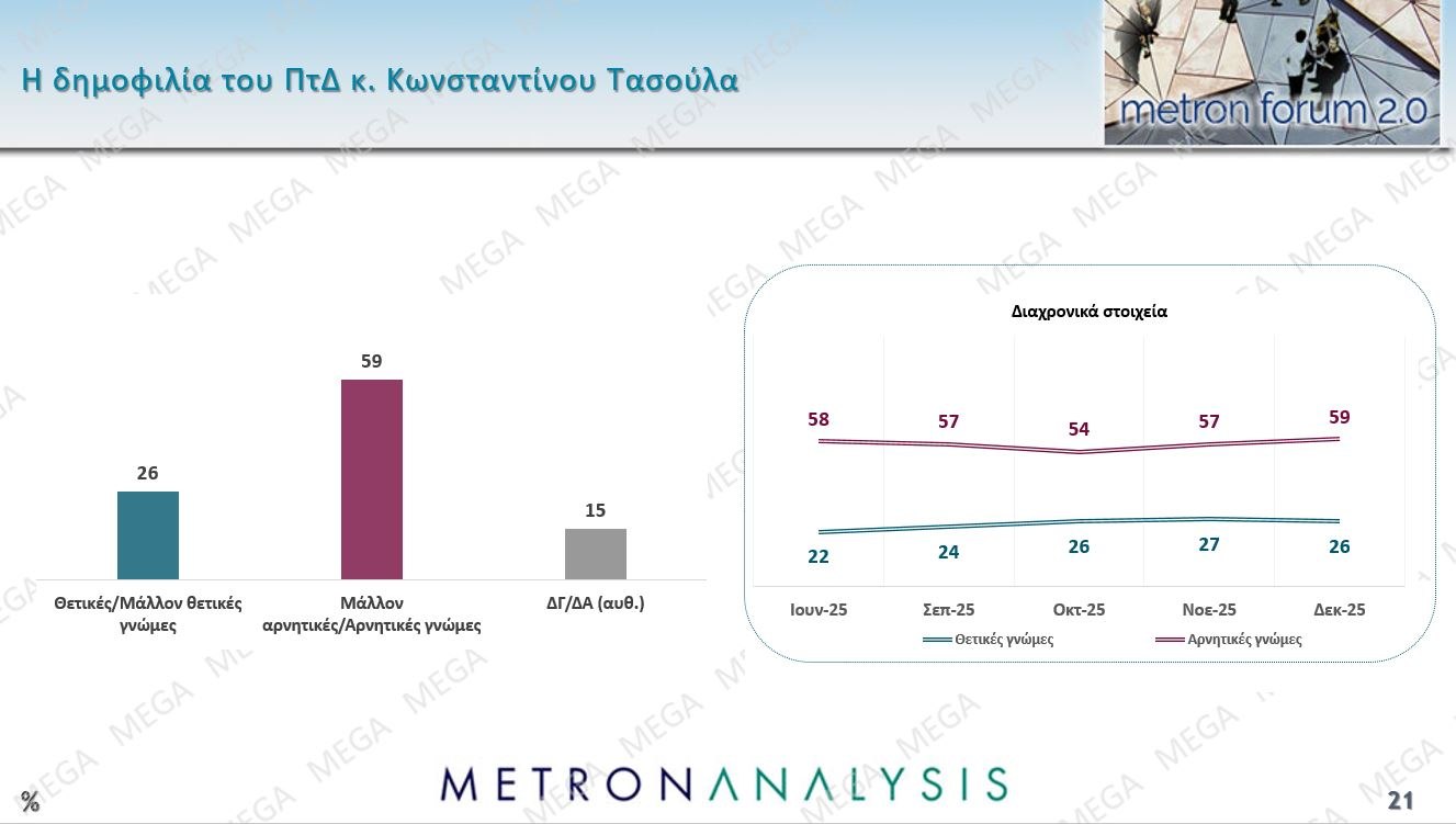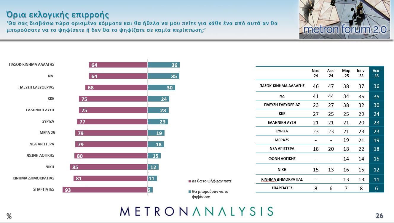 Προβάδισμα 10 μονάδων καταγράφει η Νέα Δημοκρατία έναντι του ΠΑΣΟΚ, ενώ στην 3η θέση ανέβηκε η Πλεύση Ελευθερίας, σύμφωνα με τα αποτελέσματα της δημοσκόπησης της Metron Analysis για το Mega.