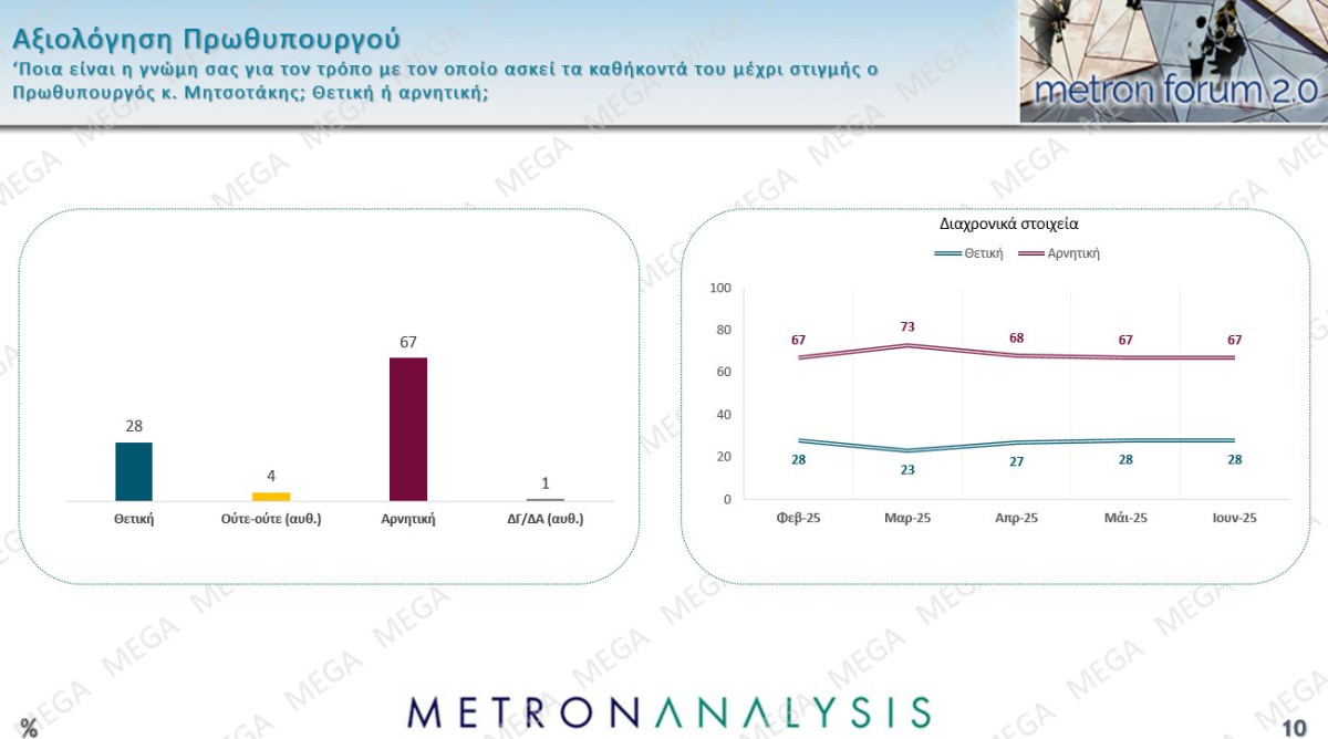 Φαίνεται από τα διαχρονικά στοιχεία της έρευνας της METRON ANALYSIS  για το ΜEGA πως το κλίμα στην κοινωνία επανήλθε στα επίπεδα του Φεβρουαρίου και ότι η ισχνή ανάκαμψη τους προηγούμενους μήνες ήταν πρόσκαιρη. Το 69% των πολιτών πιστεύει ότι η χώρα πάει προς τη λάθος κατεύθυνση, ενώ μόλις το 26% θεωρεί πως κινείται στη σωστή κατεύθυνση.