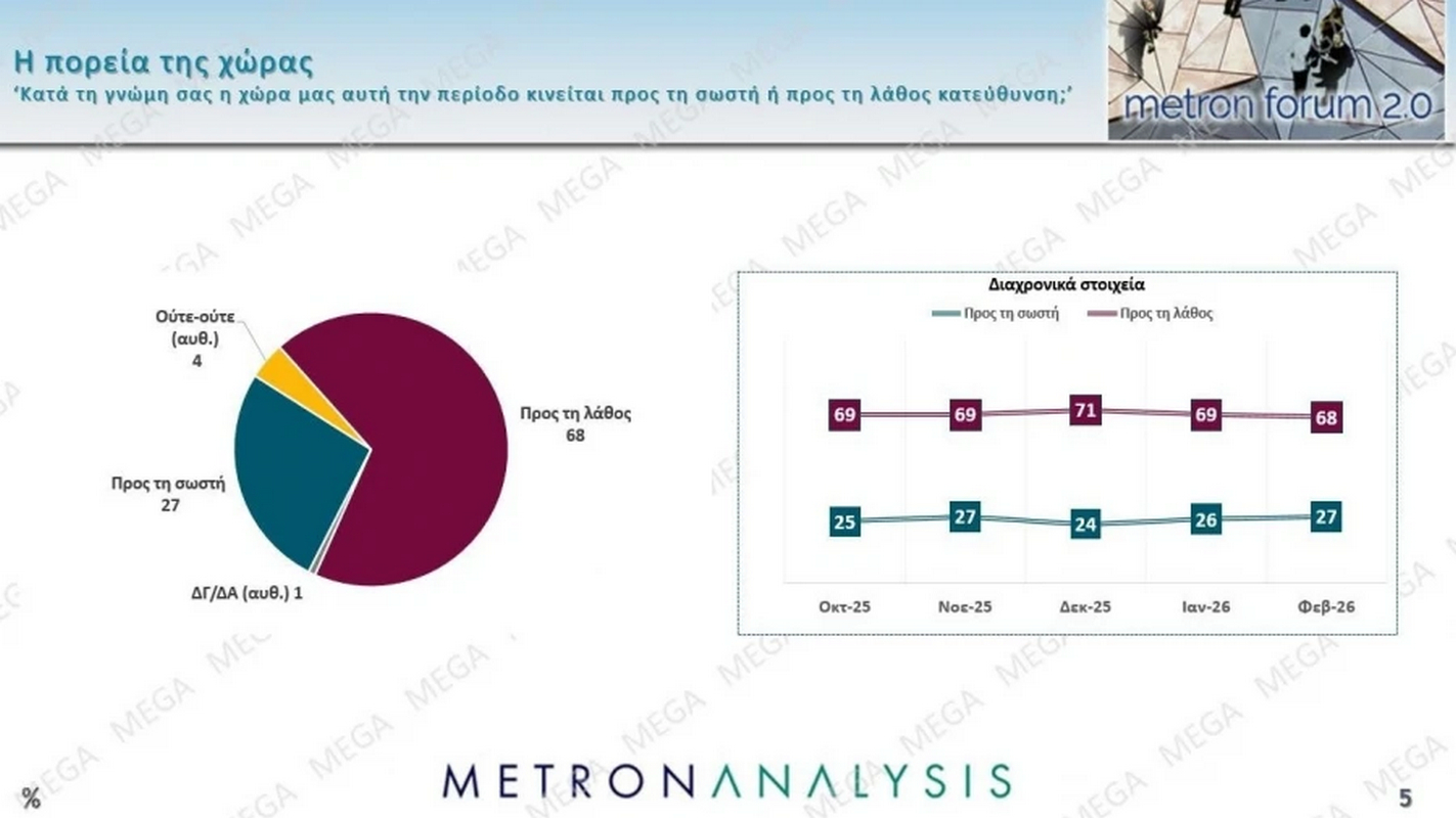 Η μεγάλη πλειονότητα των πολιτών (68%) θεωρεί ότι η χώρα κινείται σε λάθος κατεύθυνση, ενώ μόλις το 27% πιστεύει ότι τα πράγματα πηγαίνουν σωστά. Παράλληλα, μόνο το 14% δηλώνει ότι η προσωπική του κατάσταση έχει βελτιωθεί. Αντίθετα, το 43% απαντά ότι βρίσκεται σε χειρότερη κατάσταση και άλλο ένα 43% ότι παραμένει στην ίδια κατάσταση.