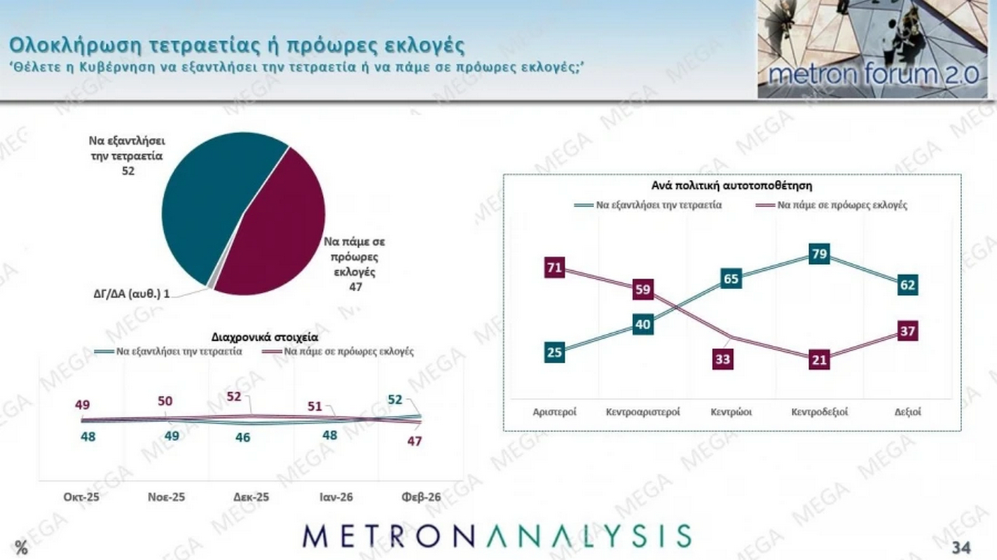 Όσον αφορά για το εάν πρέπει να πάμε σε πρόωρες εκλογές, το 52% θεωρεί ότι πρέπει να ολοκληρωθεί η τετραετία και το 47% να προκρίνει τις πρόωρες εκλογές. Υπέρ της ολοκλήρωσης της τετραετίας οι ψηφοφόροι της ΝΔ αλλά και αρκετοί ψηφοφόροι του ΠΑΣΟΚ.