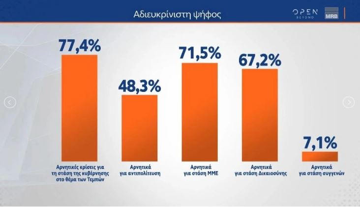Μάλιστα, το 77,4% της αδιευκρίνιστης ψήφου θεωρεί ότι η στάση της κυβέρνησης για την υπόθεση των Τεμπών δεν ήταν η σωστή, ενώ αντίστοιχα το 48,3% θεωρεί ότι η στάση της αντιπολίτευσης δεν ήταν η σωστή.