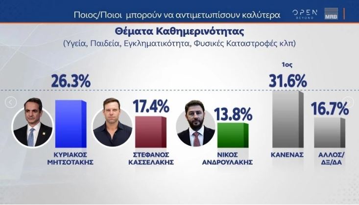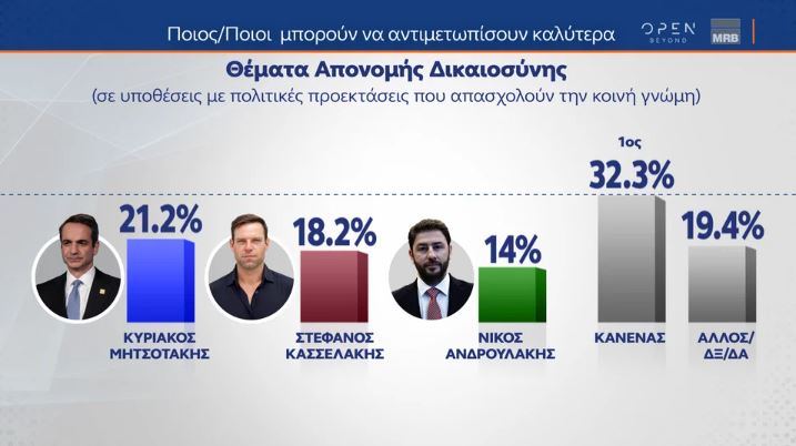 Κυριάκος Βελόπουλος: 20,6%, Αλέξης Χαρίτσης: 11%, Δημήτρης Νατσιός: 9,4% και Βασίλης Στίγκας: 4,5%.