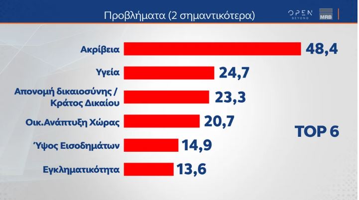 Η ακρίβεια και η υγεία είναι τα σημαντικότερα προβλήματα των πολιτών και ακολουθεί η απονομή δικαιοσύνης και το κράτος δικαίου.