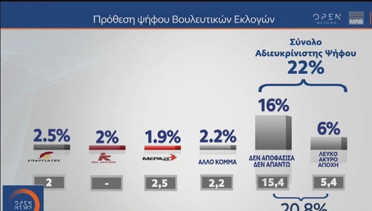 Συγκεκριμένα στην πρόθεση ψήφου η Νέα Δημοκρατία βρίσκεται στο 27,1% και ακολουθούν ΠΑΣΟΚ και ΣΥΡΙΖΑ με 9,1%. Η Ελληνική Λύση εμφανίζεται στην τέταρτη θέση με 7,1% και ακολουθεί το ΚΚΕ με 7%. Η Πλεύση Ελευθερίας καταγράφεται στο 3%, η Νίκη στο 2,8%, οι Σπαρτιάτες στο 2,1%, το ΜέΡΑ25 στο 2,1% και η Νέα Αριστερά στο 2%. Η αδιευκρίνιστη ψήφος φτάνει το 25%.