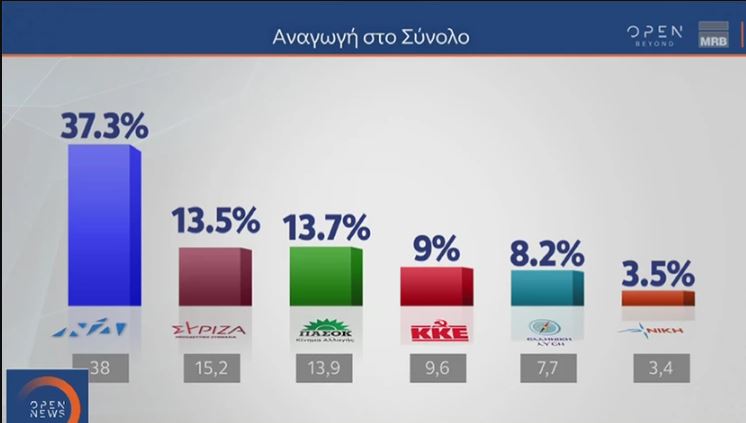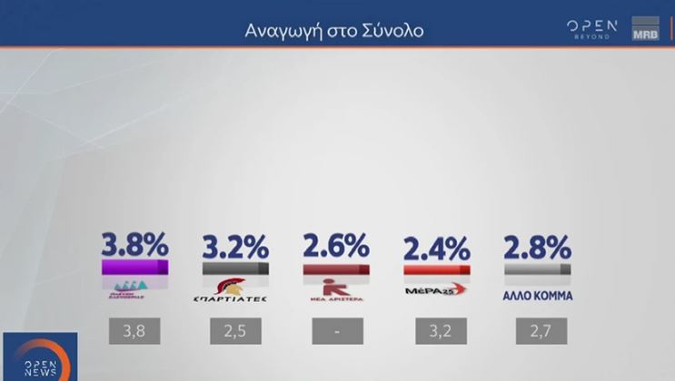 Στην εκτίμηση ψήφου, τα αντίστοιχα ποσοστά διαμορφώνονται ως εξής: Νέα Δημοκρατία 37,3%, το ΠΑΣΟΚ στο 13,7%, ο ΣΥΡΙΖΑ στο 13,5%, το ΚΚΕ στο 9%, η Ελληνική Λύση στο 8,2%, η Πλεύση στο 3,8%, η Νίκη στο 3,5%, οι Σπαρτιάτες στο 3,2%, η Νέα Αριστερά στο 2,6%, το ΜέΡΑ25 στο 2,4% και 2,8 άλλο κόμμα.