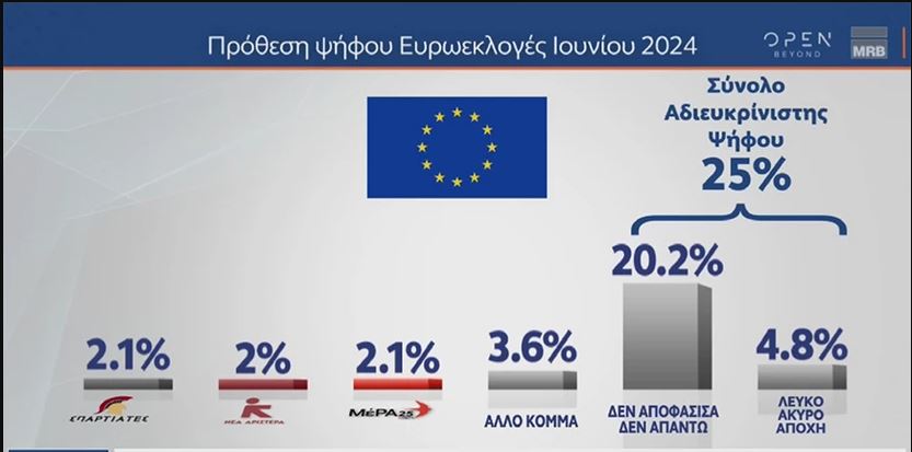 Ισοπαλία μεταξύ ΠΑΣΟΚ και ΣΥΡΙΖΑ καταγράφεται στην πρόθεση ψήφου για τις Ευρωεκλογές, σύμφωνα με τα αποτελέσματα της δημοσκόπησης που διενήργησε η εταιρεία MRB για το OPEN, σε πανελλαδικό δείγμα 1.000 ατόμων το διάστημα 22 – 24 Ιανουαρίου 2024.