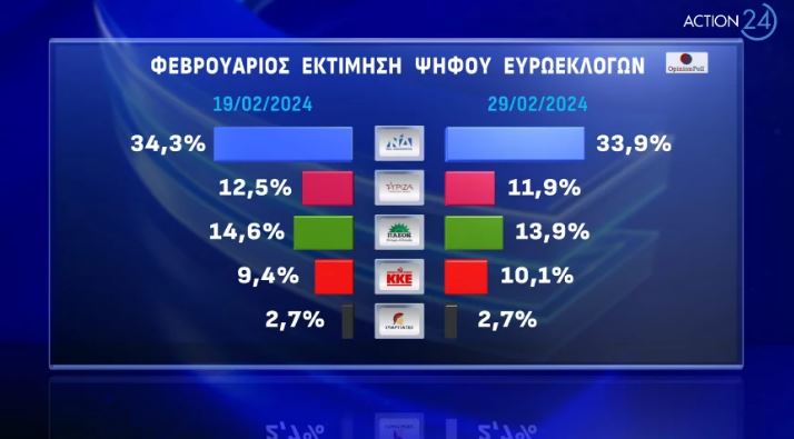 Συγκεκριμένα στην εκτίμηση ψήφου για τις ευρωεκλογές, η Νέα Δημοκρατία κυριαρχεί με 33,9% ενώ μάχη για την δεύτερη θέση δίνουν ΠΑΣΟΚ (13,9%), ΣΥΡΙΖΑ (11,9%), ΚΚΕ (10,1%) και Ελληνική Λύση (10,2%).