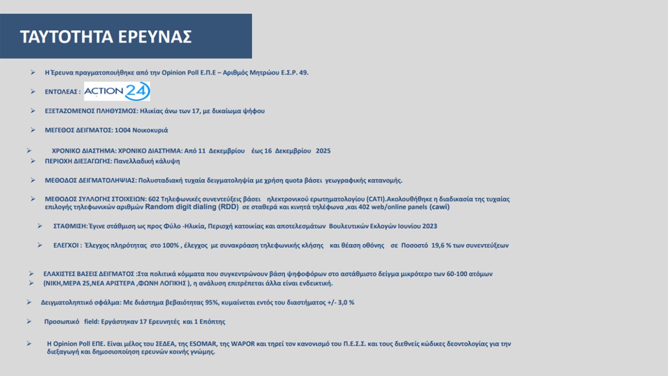 Προβάδισμα 12,9 μονάδων καταγράφει η Νέα Δημοκρατία έναντι του ΠΑΣΟΚ, σύμφωνα με τα αποτελέσματα της νέας δημοσκόπησης της Opinion Poll για το Action 24.