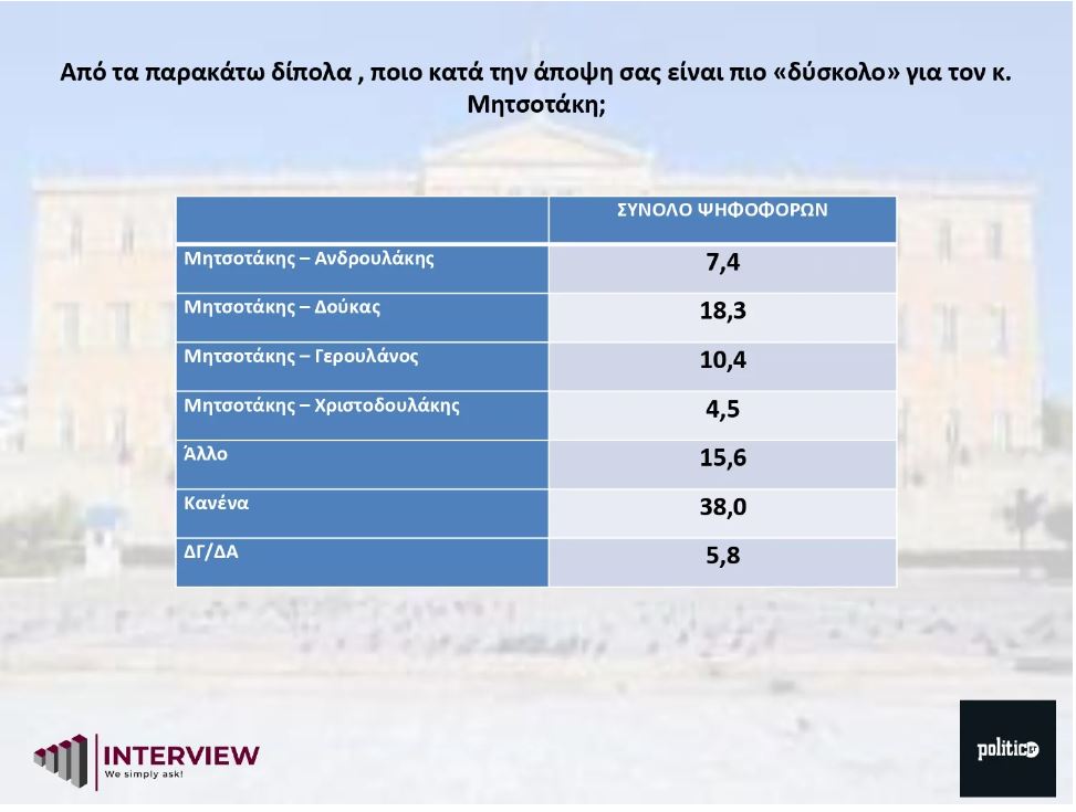 Ενδιαφέρον παρουσιάζει και η καρτέλα που δείχνει ποιος διεκδικητής της ηγεσίας του ΠΑΣΟΚ θα μπορούσε να αποτελέσει μεγαλύτερη απειλή απέναντι στον Κυριάκο Μητσοτάκη.