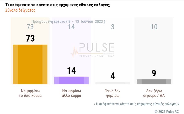 Στο ερώτημα «τι σκέφτεστε να κάνετε στις ερχόμενες εθνικές εκλογές;» το 73% απαντά ότι θα ψηφίσει το ίδιο κόμμα. Το 14% δηλώνει ότι σκέφτεται να ψηφίσει άλλο κόμμα, το 4% απαντά ότι ίσως δεν ψηφίσει και το 9% λέει ότι δεν ξέρει σίγουρα/δεν απαντά.