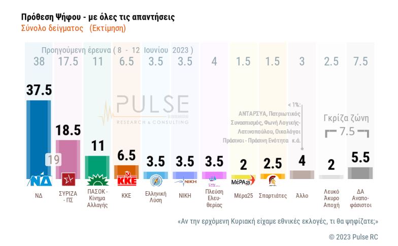Στην πρόθεση ψήφου η ΝΔ έρχεται πρώτη με ποσοστό 37,5%. Ο ΣΥΡΙΖΑ λαμβάνει 18,5% και ακολουθεί το ΠΑΣΟΚ με 11%. Το ΚΚΕ συγκεντρώνει το 6,5%. Στην Βουλή με ποσοστό 3,5% αντίστοιχα φαίνεται ότι εισέρχονται η Ελληνική Λύση, η ΝΙΚΗ και η Πλεύση Ελευθερίας.