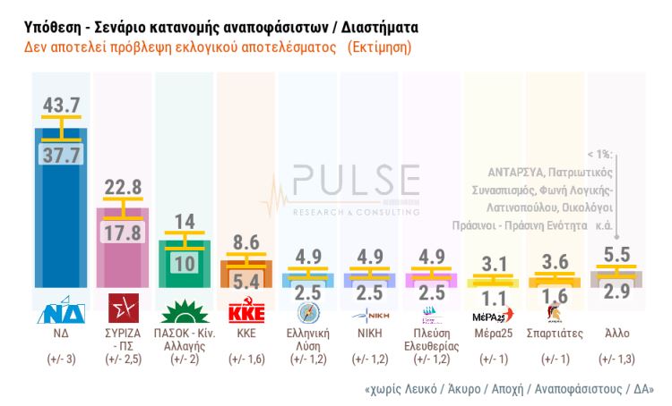 Σε ένα υποθετικό αριθμητικό σενάριο κατανομής αναλογικά των αναποφάσιστων η ΝΔ θα μπορούσε να λάβει από 37,7% έως 43,7%. Ο ΣΥΡΙΖΑ λαμβάνει από 17,8% έως 22,8%, το ΠΑΣΟΚ από 10% έως 14% και το ΚΚΕ από 5,4% έως 8,6%. Ακολουθεί η Ελληνική Λύση το ποσοστό της θα μπορούσε να κυμανθεί από 2,5% έως 4,9%. Το ίδιο εύρος ποσοστών λαμβάνει η ΝΙΚΗ και η Πλεύση Ελευθερίας. Το Μέρα25 λαμβάνει από 1,1% έως 3,1%, το κόμμα Σπαρτιάτες από 1,6 έως 3,6%. Η επιλογή «άλλο κόμμα» λαμβάνει από 2,9% έως 5,5%.