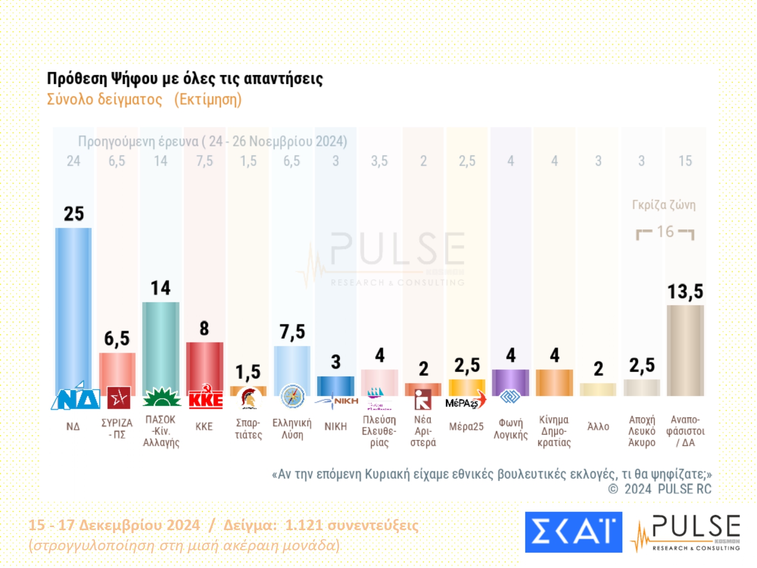 Συγκεκριμένα, στην πρόθεση ψήφου η ΝΔ καταγράφει ποσοστό 25% και στη δεύτερη θέση έρχεται το ΠΑΣΟΚ με 14%. Ακολουθούν, το ΚΚΕ με ποσοστό 8%, η Ελληνική Λύση με 7,5%, ο ΣΥΡΙΖΑ-ΠΣ με 6,5%, η Πλεύση Ελευθερίας, το Κίνημα Δημοκρατίας και η Φωνή Λογικής με 4% και η Νίκη με 3%. Το ΜέΡΑ25 καταγράφει ποσοστό 2,5% και η Νέα Αριστερά με 2%. Το ποσοστό των αναποφάσιστων ανέρχεται σε 13,5%.