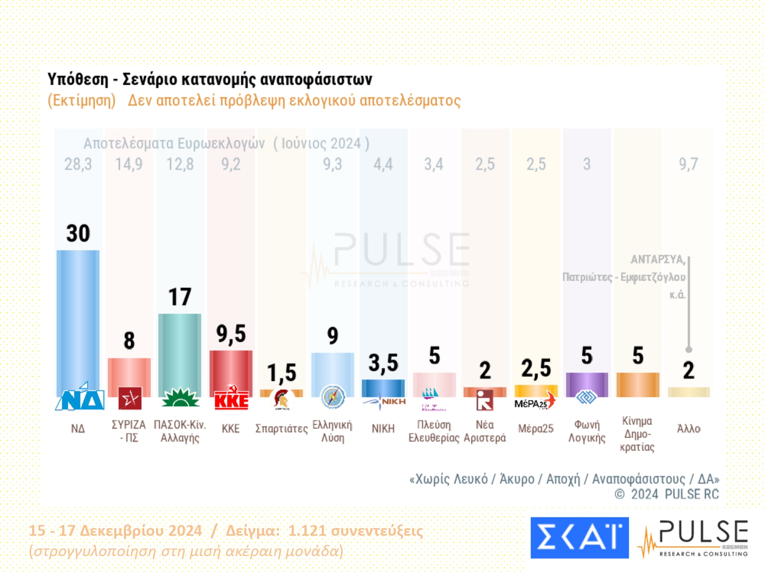 Συγκεκριμένα, στην πρόθεση ψήφου η ΝΔ καταγράφει ποσοστό 25% και στη δεύτερη θέση έρχεται το ΠΑΣΟΚ με 14%. Ακολουθούν, το ΚΚΕ με ποσοστό 8%, η Ελληνική Λύση με 7,5%, ο ΣΥΡΙΖΑ-ΠΣ με 6,5%, η Πλεύση Ελευθερίας, το Κίνημα Δημοκρατίας και η Φωνή Λογικής με 4% και η Νίκη με 3%. Το ΜέΡΑ25 καταγράφει ποσοστό 2,5% και η Νέα Αριστερά με 2%. Το ποσοστό των αναποφάσιστων ανέρχεται σε 13,5%.