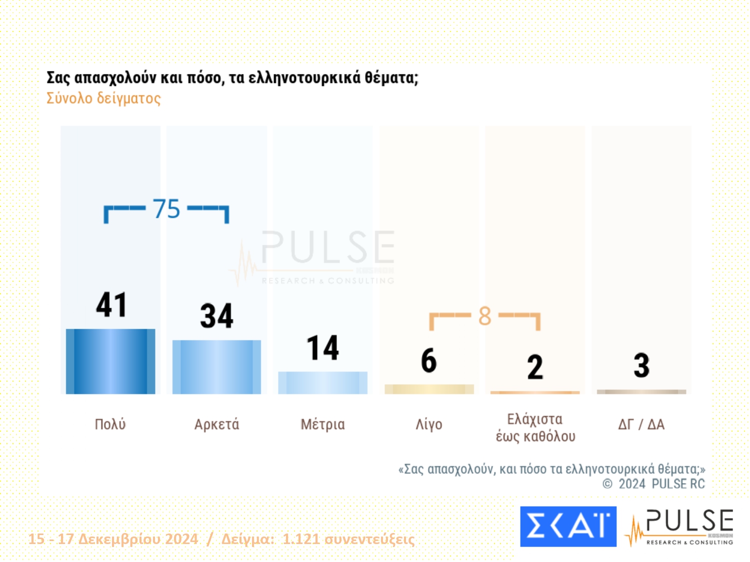 Ανάλογα είναι τα ποσοστά του προβληματισμού των πολιτών και στα ελληνοτουρκικά, κυρίως σε ότι αφορά τις τελευταίες κινήσεις της Τουρκίας στο γενικότερο πλαίσιο.