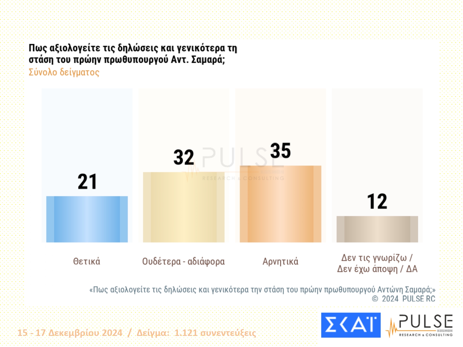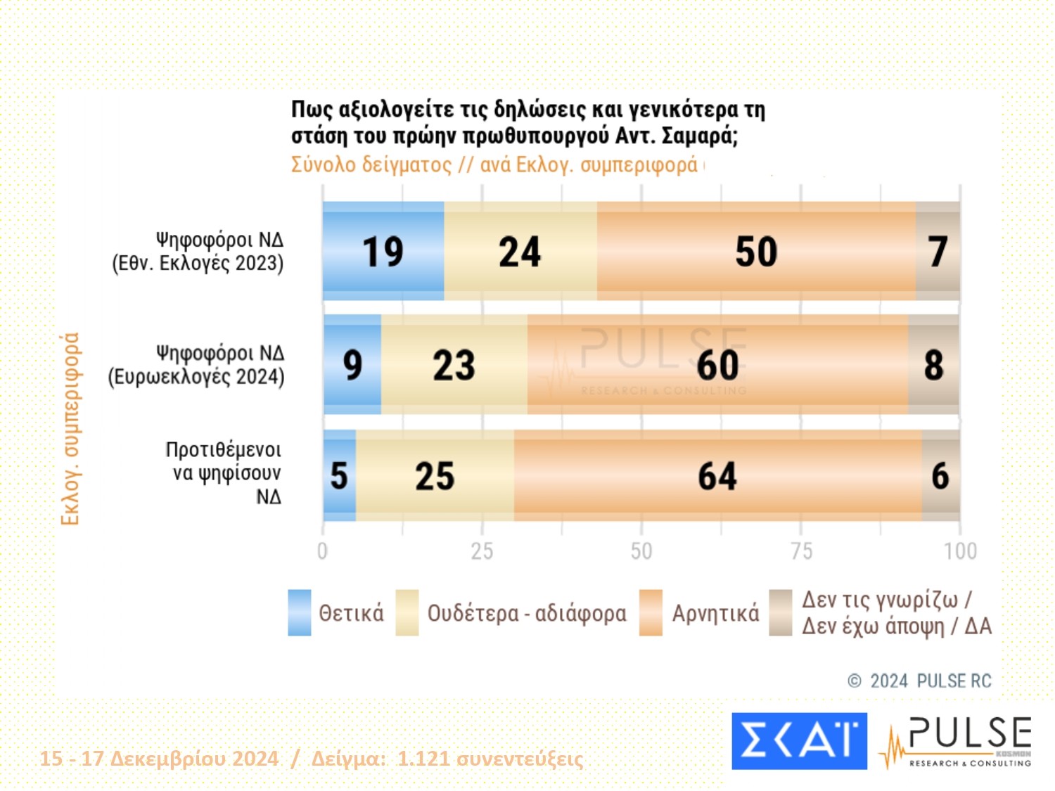 Όσον αφορά στην εσωτερική επικαιρότητα, οι ερωτηθέντες παρουσιάστηκαν αδιάφοροι ή αρνητικοί για τις κινήσεις του Αντώνη Σαμαρά, συνέπεια των οποίων ήταν η διαγραφή του από την κοινοβουλευτική ομάδα της Νέας Δημοκρατίας.