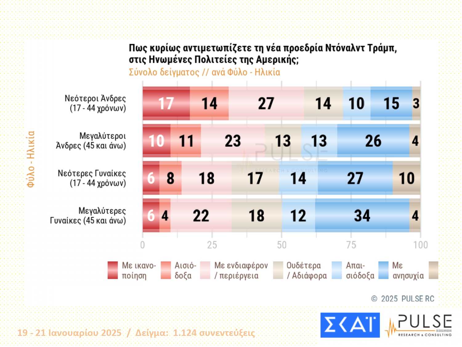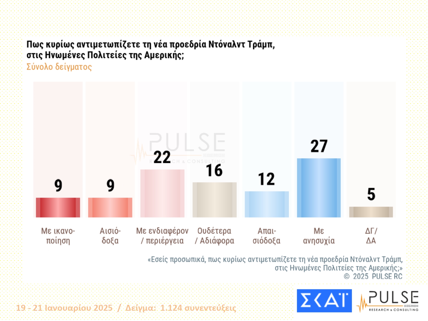 Την ανησυχία τους εκφράζουν σχεδόν 1 στους 3 πολίτες για τη νέα θητεία του Ντόναλντ Τραμπ στην προεδρία των ΗΠΑ. Ειδικότερα, το 27% βλέπει με ανησυχία τη 2η θητεία του Τραμπ και το 12% με απαισιοδοξία. Παράλληλα, το 18% βλέπει την προεδρία Τραμπ με ικανοποίηση/αισιοδοξία και το 22% με ενδιαφέρον/περιέργεια.