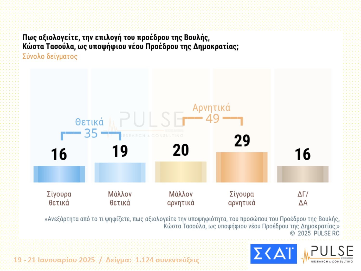 Στο μεταξύ, αρνητικά βλέπει η πλειοψηφία την επιλογή του πρώην προέδρου της Βουλής, Κώστα Τασούλα, για υποψήφιο Πρόεδρο της Δημοκρατίας. Ειδικότερα, το 49% βλέπει αρνητικά την επιλογή Τασούλα ενώ θετική εκτίμηση έχει το 35%. Δεν γνωρίζω/Δεν απαντώ απάντησε το 16%.