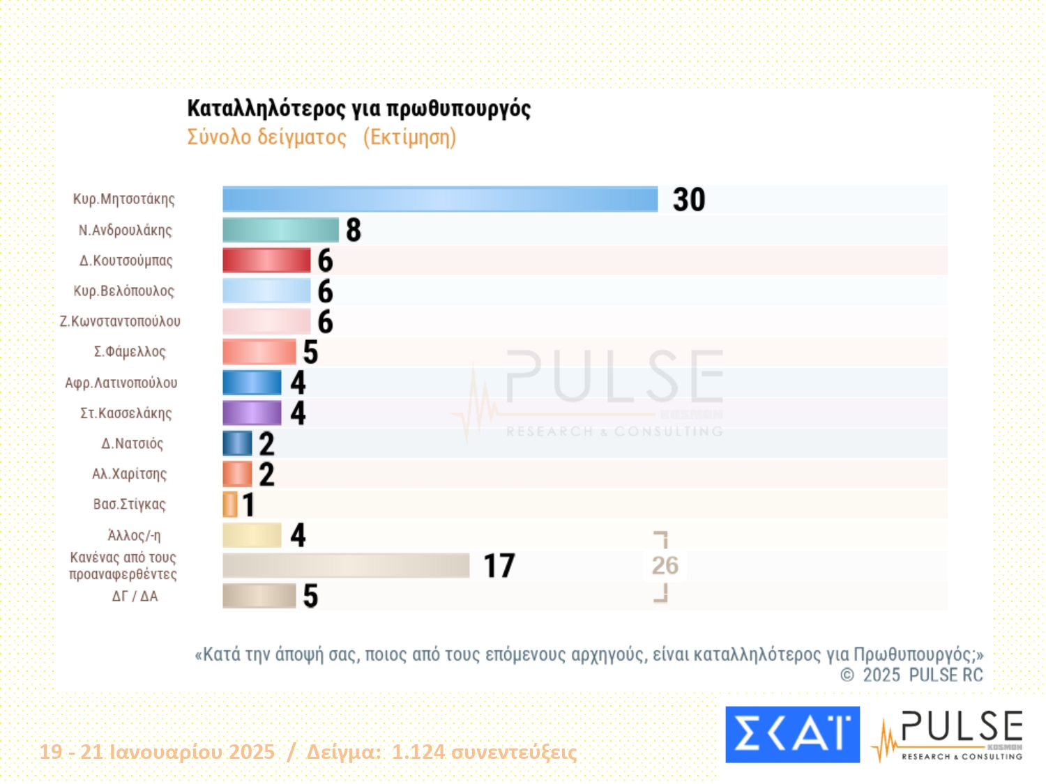 Στην ερώτηση για το ποιος είναι καταλληλότερος για πρωθυπουργός, ο Κυριάκος Μητσοτάκης συγκεντρώνει το 30% και έχει μεγάλη διαφορά από τον δεύτερο Ανδρουλάκη με 8%, ενώ από 6% συγκεντρώνουν οι Δημήτρης Κουτσούμπας, Κυριάκος Βελόπουλος και Ζωή Κωνσταντοπούλου ενώ το 17% συγκεντρώνει η απάντηση Κανένας.