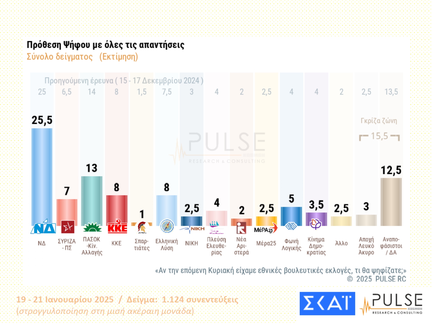 Προβάδισμα 12,5 μονάδων της Νέας Δημοκρατίας έναντι του ΠΑΣΟΚ και ισοψηφία στην τρίτη θέση μεταξύ του ΚΚΕ και της Ελληνικής Λύσης, καταγράφει η δημοσκόπηση της Pulse που παρουσιάστηκε στο κεντρικό δελτίο ειδήσεων του ΣΚΑΪ το βράδυ της Πέμπτης.