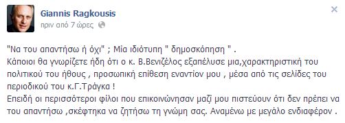 Μια ιδιότυπη ψηφοφορία διενεργεί ο πρώην υπουργός Γιάννης Ραγκούσης και ρωτά τους χρήστες του facebook, μέσα από το προφίλ του, για τον… Ευάγγελο Βενιζέλο.