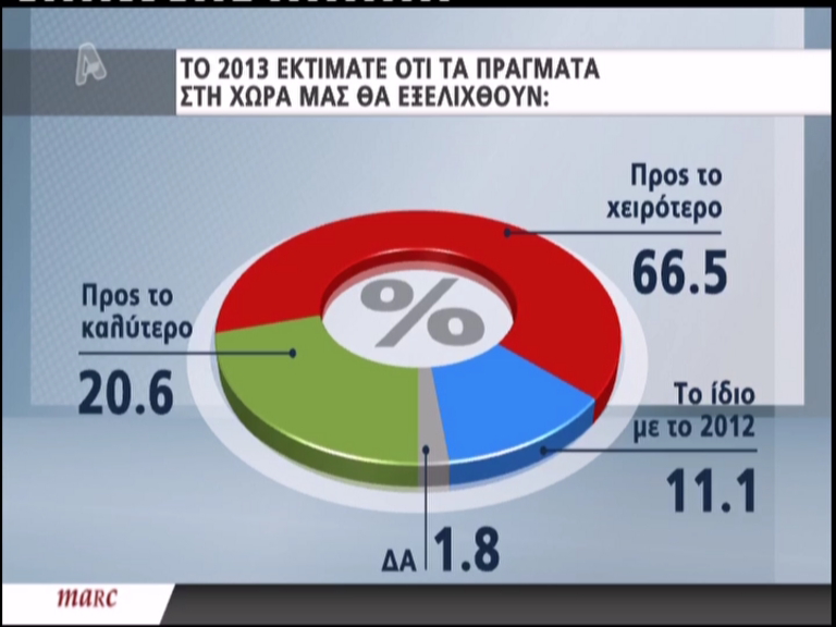 Ταυτόχρονα, σχεδόν 6 στους 10, πιστεύουν πως το 2013 η κατάσταση στην Ελλάδα θα εξελιχθεί προς το χειρότερο, με μόνο το 20,6% να πιστεύει πως θα υπάρξει μία καλύτερη εξέλιξη.