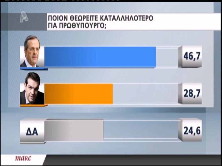 Καταλληλότερος πρωθυπουργός θεωρείται ο Α. Σαμαράς με ποσοστό 46,7% έναντι του Αλέξη Τσίπρα, που συγκεντρώνει 28,7%.
