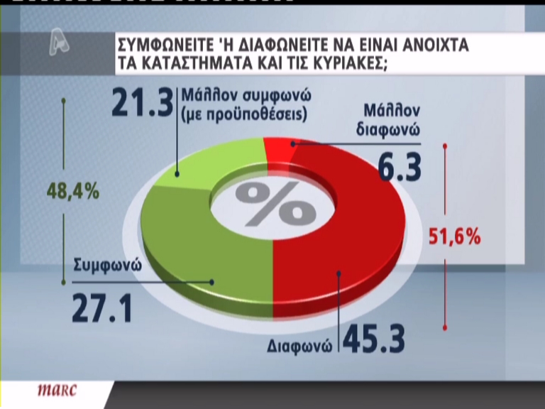 Για το ζήτημα των καταστημάτων, και το αν συμφωνούν να παραμένουν ανοικτά τις Κυριακές, οι ερωτηθέντες απάντησαν, με μικρή διαφορά, αρνητικά σε ποσοστό 51,6%, ενώ σύμφωνους βρίσκει το 48,4%.