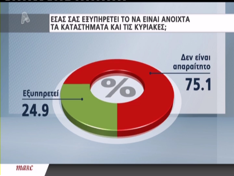 Αρκετά μεγάλο είναι και το ποσοστό, 75,1%  που απάντησαν πως δεν τους εξυπηρετεί η Κυριακή και δεν θεωρούν απαραίτητο να μένουν ανοικτά τα καταστήματα.
