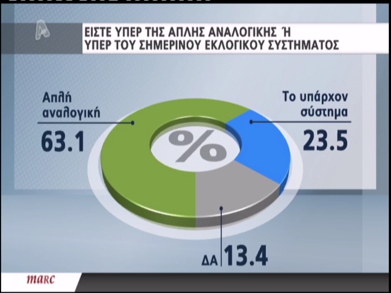 Όσον αφορά στο εκλογικό σύστημα που θεωρούν καταλληλότερο οι ερωτηθέντες απάντησαν με ποσοστό 63,1% υπέρ της “απλής αναλογικής” και 23,5% προτιμούν το ήδη υπάρχον εκλογικό σύστημα.