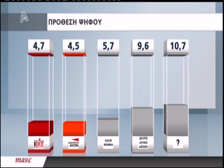 Ο ΣΥΡΙΖΑ στην πρόθεση ψήφου συγκεντρώνει 22,7%, η ΝΔ 21,5%, η Χρυσή Αυγή 9,6%, το ΠΑΣΟΚ 5,6%, οι Ανεξάρτητοι Έλληνες 5,4%, το ΚΚΕ 4,7%, η ΔΗΜΑΡ 4,5% ενώ άλλο κόμμα απάντησε το 5,7% των ερωτηθέντων.