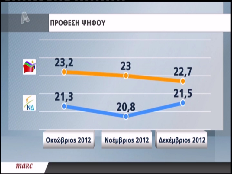 Προβάδισμα με 1,2% του ΣΥΡΙΖΑ έναντι της ΝΔ καταγράφει η έρευνα της «Marc» για την εκπομπή ALPHA Δημοσκόπηση.