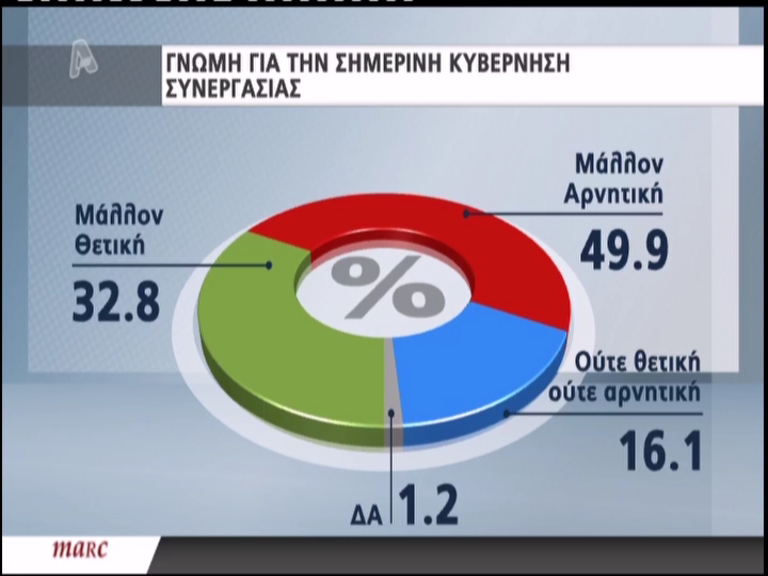 Οι μισοί ερωτηθέντες, σε ποσοστό 49,9%, έχουν αρνητική γνώμη για την κυβέρνηση συνεργασίας, ενώ το 32,8% έχει θετική.
