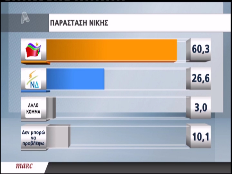 Στην ερώτηση για την παράσταση νίκης ο ΣΥΡΙΖΑ παίρνει 60,3% και η ΝΔ 26,6%.
