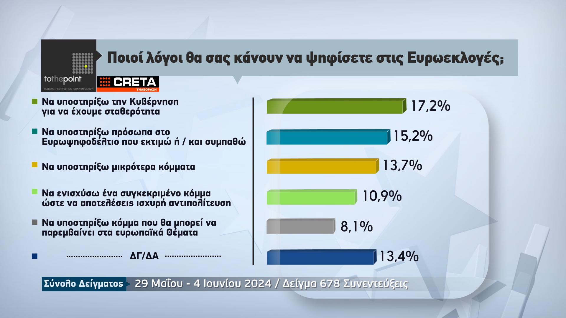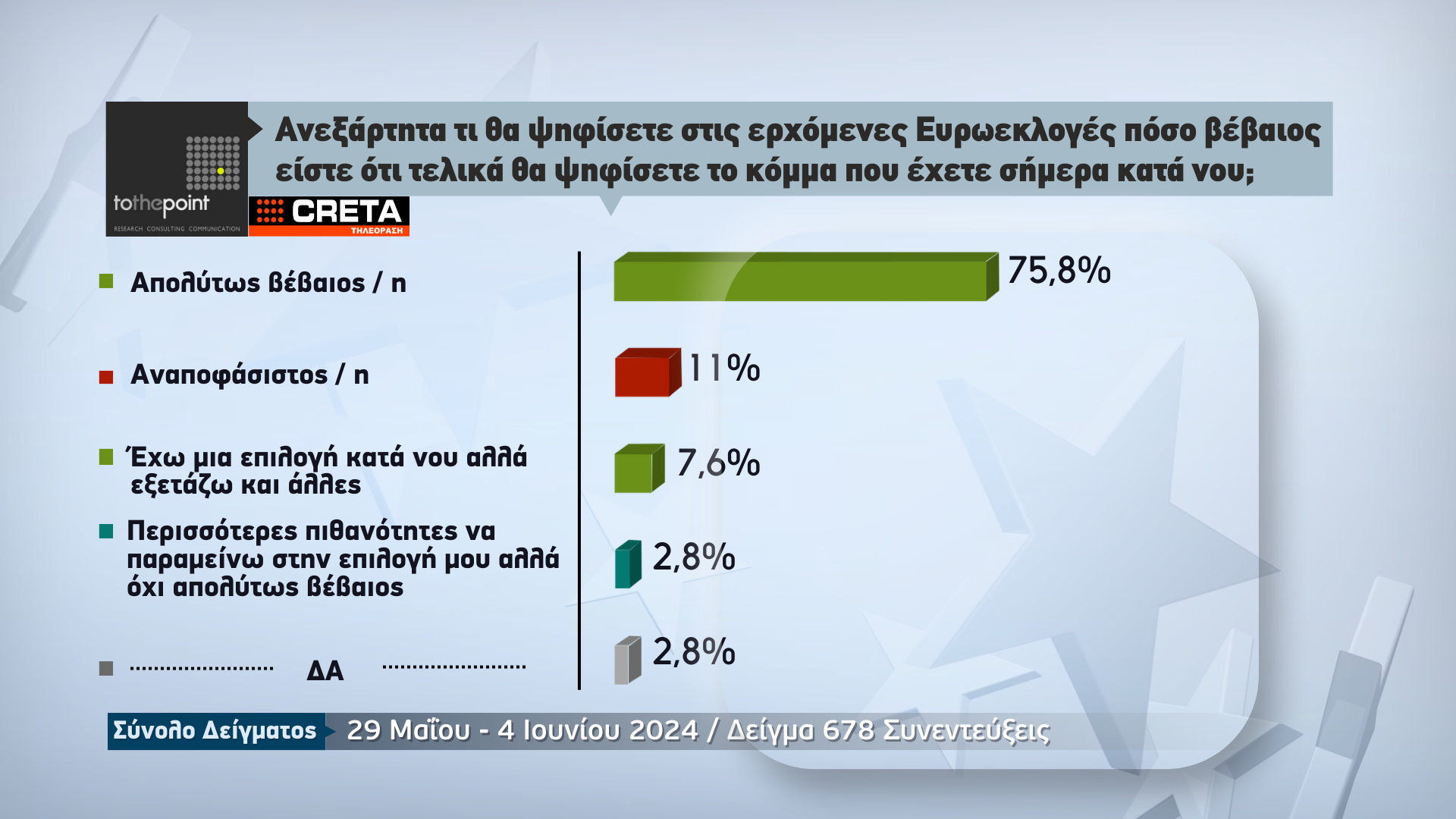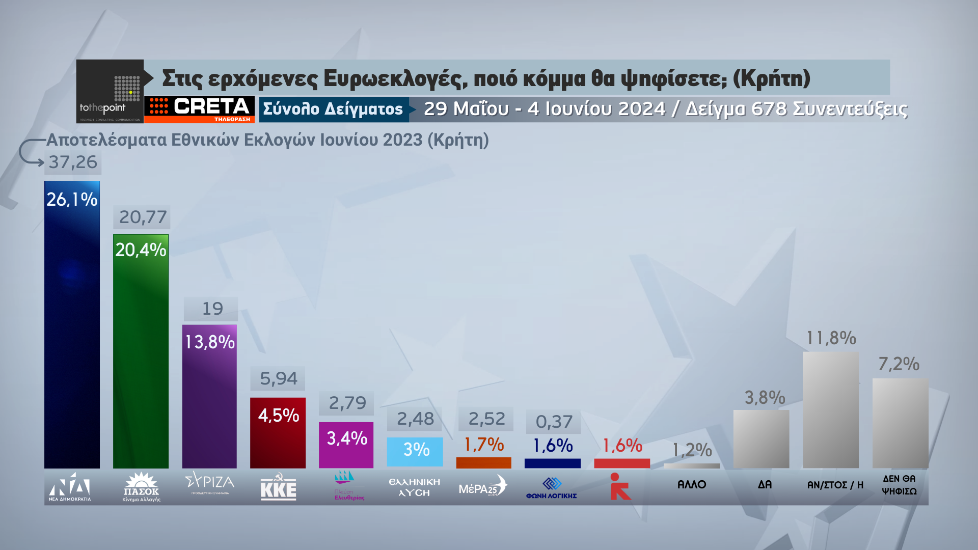Την πρόθεση ψήφου των πολιτών για την Κρήτη, λίγα μόλις 24ωρα πριν από τις κρίσιμες ευρωεκλογές της 9ης Ιουνίου, παρουσιάζει η μεγάλη δημοσκόπηση που πραγματοποιήθηκε από την εταιρεία ερευνών «Το The Point» για λογαριασμό της Τηλεόρασης CRETA.