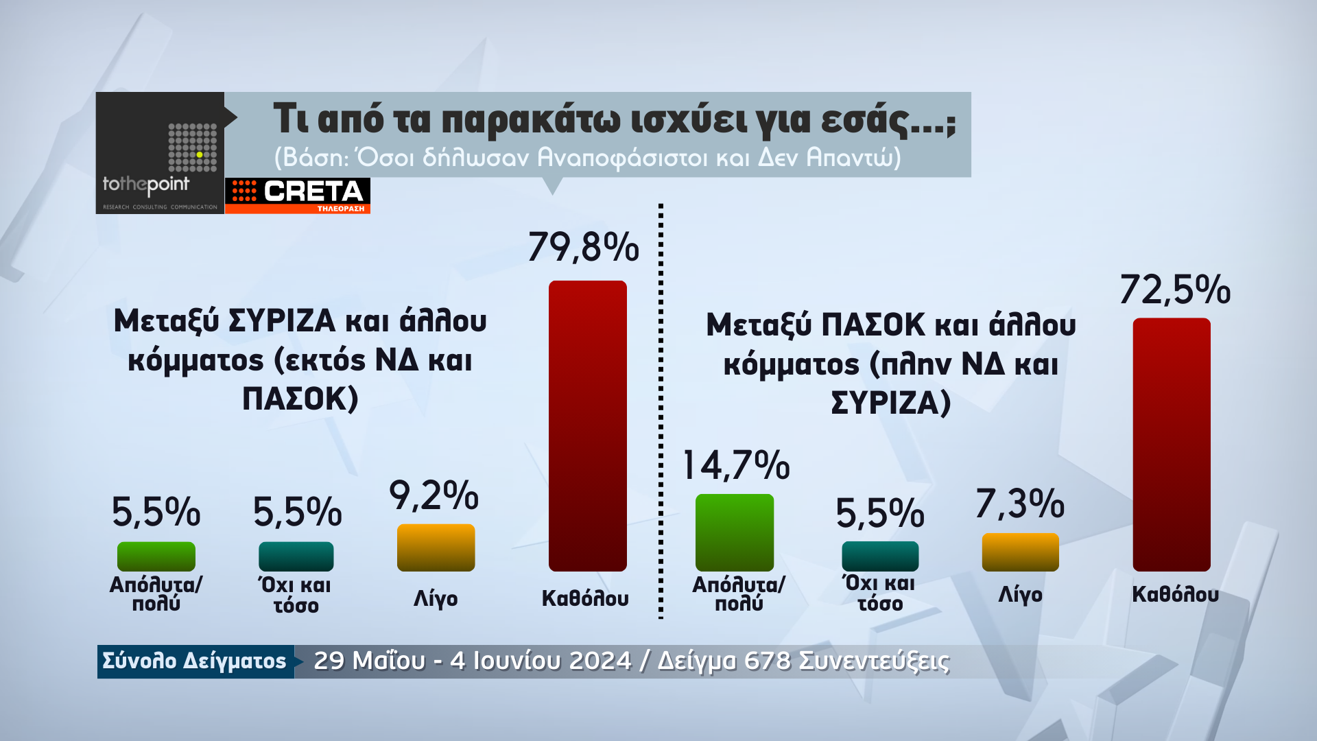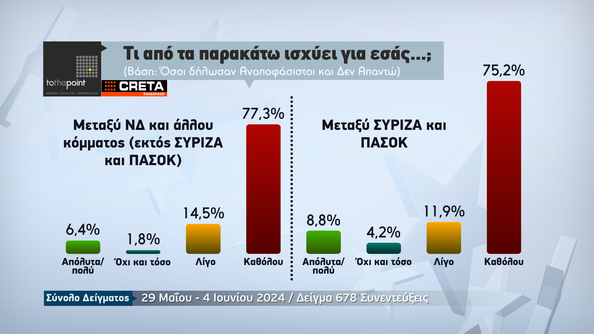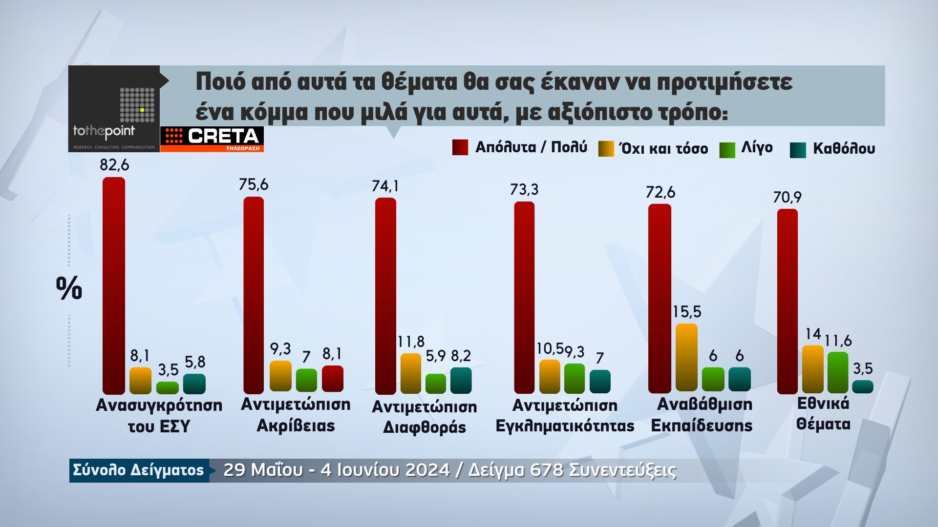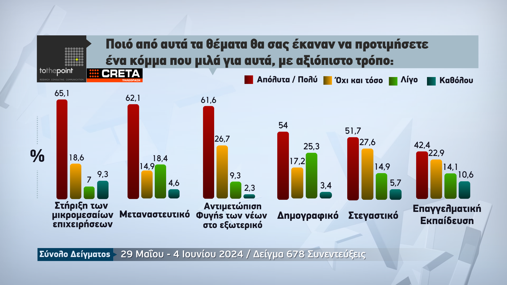 Την πρόθεση ψήφου των πολιτών για την Κρήτη, λίγα μόλις 24ωρα πριν από τις κρίσιμες ευρωεκλογές της 9ης Ιουνίου, παρουσιάζει η μεγάλη δημοσκόπηση που πραγματοποιήθηκε από την εταιρεία ερευνών «Το The Point» για λογαριασμό της Τηλεόρασης CRETA.