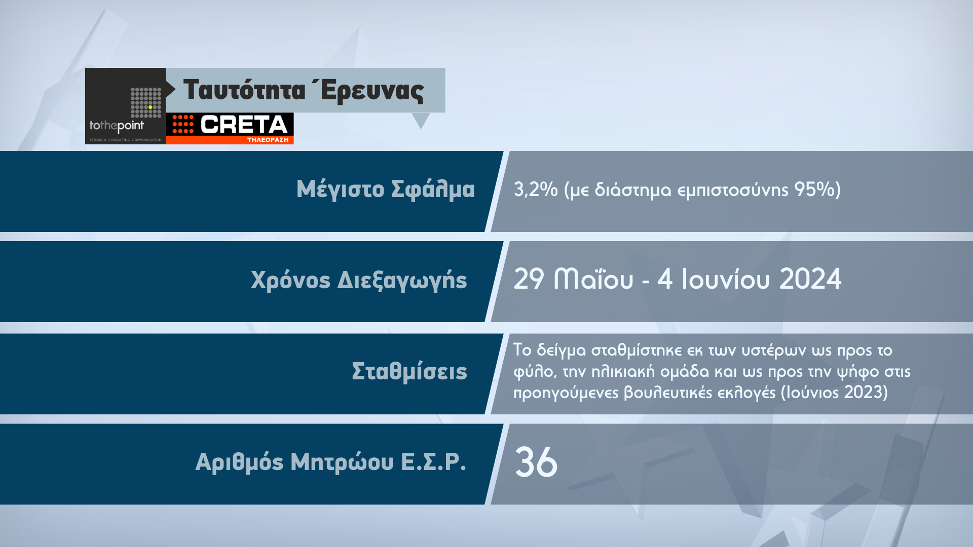 Η δημοσκόπηση πραγματοποιήθηκε το διάστημα 29 Μαΐου έως 4 Ιουνίου μέσω τηλεφωνικών, υποβοηθούμενων από Η/Υ, συνεντεύξεων, σε δείγμα 678 ατόμων σε όλες τις Περιφερειακές Ενότητες της Κρήτης.