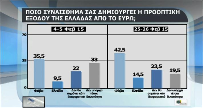 Στο ερώτημα «ποιο συναίσθημα σας γεννά η πιθανή έξοδος της Ελλάδας από το ευρώ» το ποσοστό εκείνων που απαντούν φόβο φτάνει στο 42,5%, 14,5% απαντά ελπίδα, το 23,5% κανένα συναίσθημα και 19,5% δεν πιστεύει ότι υπάρχει τέτοια δυνατότητα.
