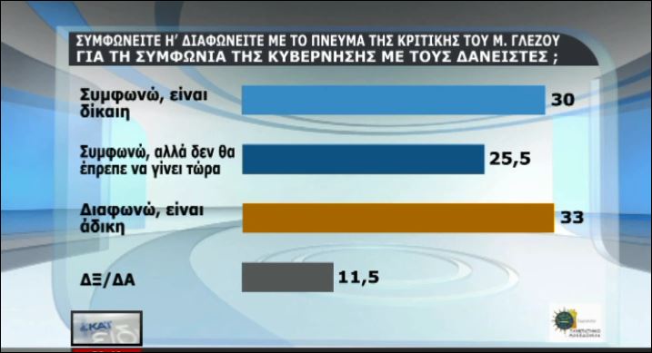 Αναφορικά με την κριτική του Μανώλη Γλέζου, το 30% πιστεύει πως ήταν δίκαιη και συμφωνεί, ένα 25,5% αναφέρει πως συμφωνεί αλλά δεν έπρεπε να γίνει τώρα, ενώ ποσοστό 33% διαφωνεί και τη θεωρεί άδικη.