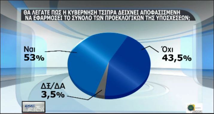 Το 53% εκτιμά ότι η κυβέρνηση είναι αποφασισμένη να τηρήσει το σύνολο των προεκλογικών υποσχέσεων, ενώ 43,5% όχι.
