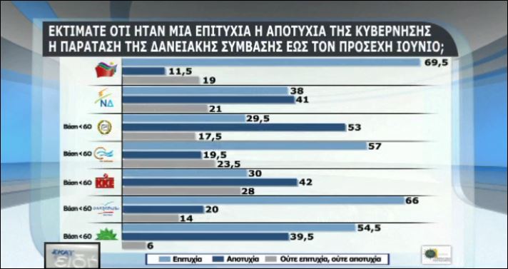Συγκεκριμένα, η παράταση της δανειακής σύμβασης είναι επιτυχία για το 69,5% των ψηφοφόρων του ΣΥΡΙΖΑ, αποτυχία για το 11,5% και ούτε επιτυχία/ούτε αποτυχία για το 19%. Για τους ψηφοφόρους της ΝΔ 38% θεωρεί την παράταση επιτυχία, 41% αποτυχία, και 21% ούτε επιτυχία/ούτε αποτυχία.