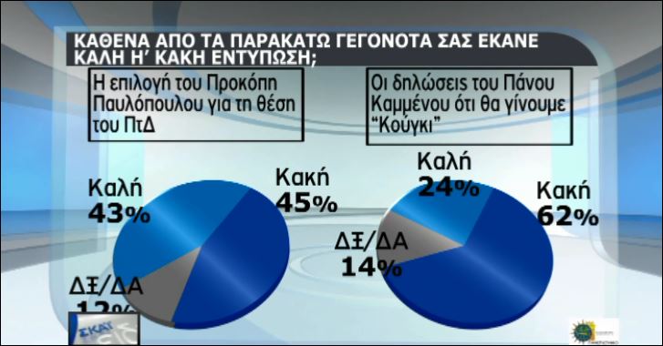 Τέλος, κακή σε ποσοστό 45% οι ερωτηθέντες θεωρούν την επιλογή του Προκόπη Παυλόπουλου για τη θέση του Προέδρου της Δημοκρατίας, ενώ το 62% πιστεύει πως η δήλωση του Πάνου Καμμένου «θα τα κάνουμε Κούγκι» ήταν κακή.