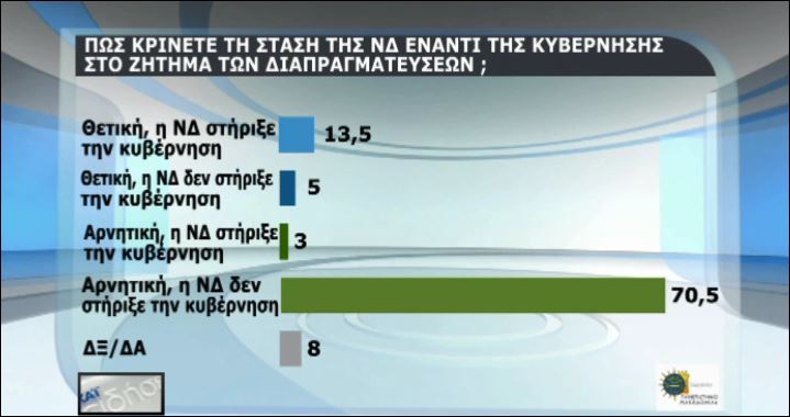 Την ίδια στιγμή, η στάση της ΝΔ έναντι της κυβέρνησης στο ζήτημα των διαπραγματεύσεων κρίνεται ως θετική (η ΝΔ στήριξε την κυβέρνηση) από το 13,5% , θετική επειδή δεν στήριξε την κυβέρνηση από το 5%, αρνητική επειδή η ΝΔ στήριξε την κυβέρνηση από 3%, αρνητική επειδή η ΝΔ δεν στήριξε την κυβέρνηση από το 70,5%.