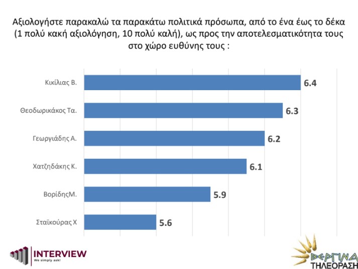 Από τη δημοσκόπηση της Interview για λογαριασμό του «Βεργίνα TV» προκύπτουν ενδιαφέροντα στοιχεία από τις απαντήσεις των πολιτών και στην αξιολόγηση του έργου των υπουργών της Κυβέρνησης με κλίμακα από το ένα έως το 10.