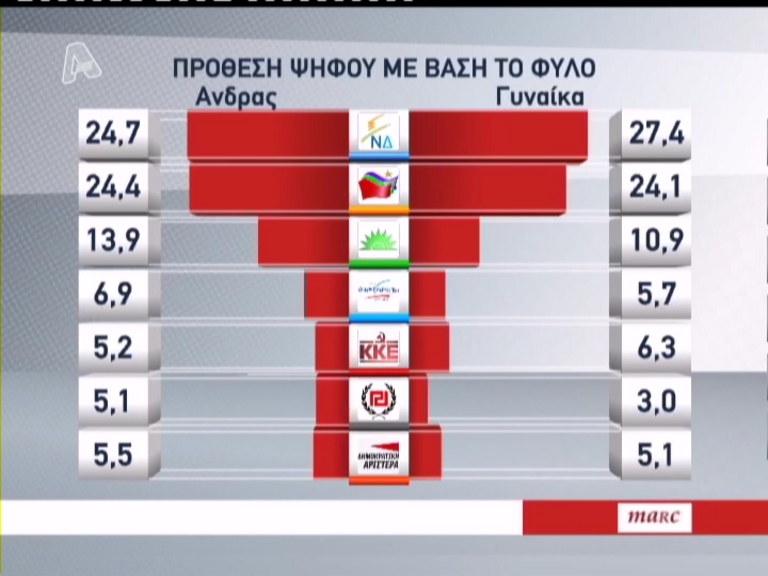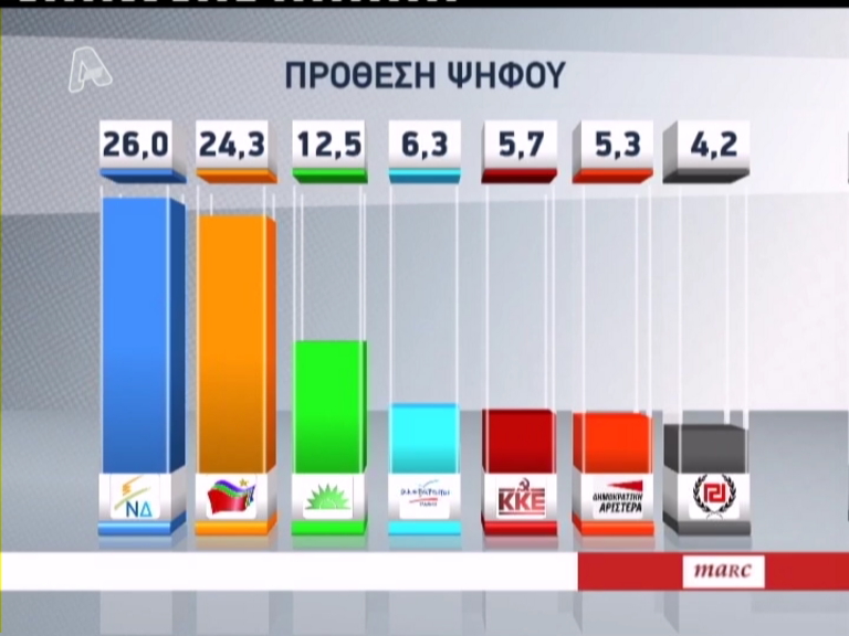 Σημειώνεται ότι στη γενική πρόθεση ψήφου της Marc για τον ALPHA τα αποτελέσματα έχουν ως εξής. Στην πρόθεση ψήφου η ΝΔ συγκεντρώνει 26%, ενώ ακολουθεί ο ΣΥΡΙΖΑ με 24,3%.