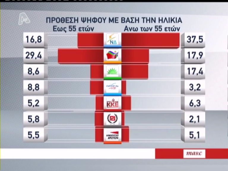 Στην πρόθεση ψήφου με βάση την ηλικία, φαίνεται ότι η ΝΔ καταγράφει μεγάλο προβάδισμα στις ηλικίες άνω των 55 ετών, αφού συγκεντρώνει 37,5% έναντι μόλις 17,9% του ΣΥΡΙΖΑ.Αντίστροφα, ο ΣΥΡΙΖΑ προηγείται κατά πολύ στις ηλικίες έως 55 ετών, αφού συγκεντρώνει ποσοστό 29,4% στην πρόθεση ψήφου με βάση την ηλικία, ενώ η ΝΔ 16,8%. Ανεβασμένο στις ηλικίες άνω των 55 ετών είναι και το ΠΑΣΟΚ με 17,4%.