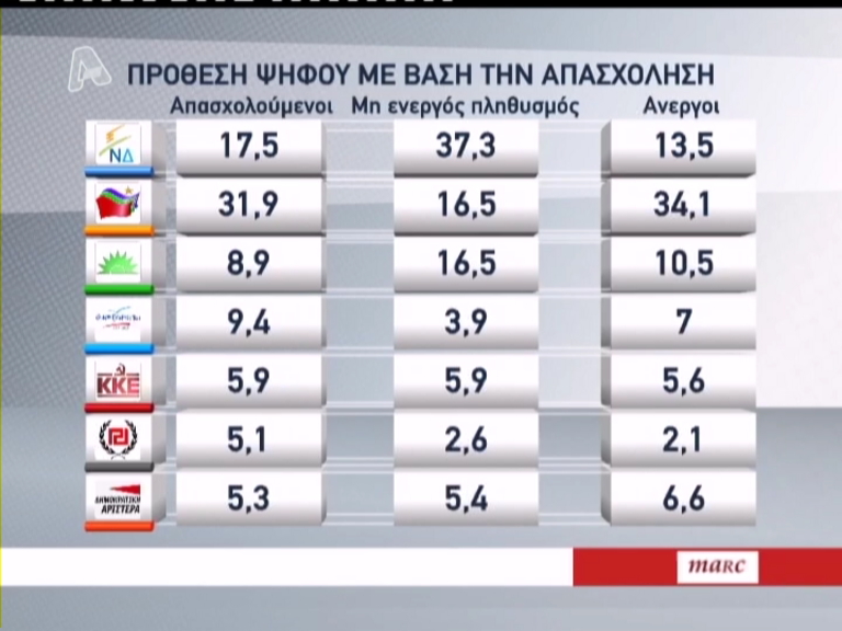 Τέλος, στην πρόθεση ψήφου με βάση την απασχόληση, φαίνεται ότι η ΝΔ έχει μεγάλο προβάδισμα στον μη ενεργό πληθυσμό (37,3%), ενώ ο ΣΥΡΙΖΑ στους απασχολούμενους (31,9%) και τους ανέργους (34,1%).