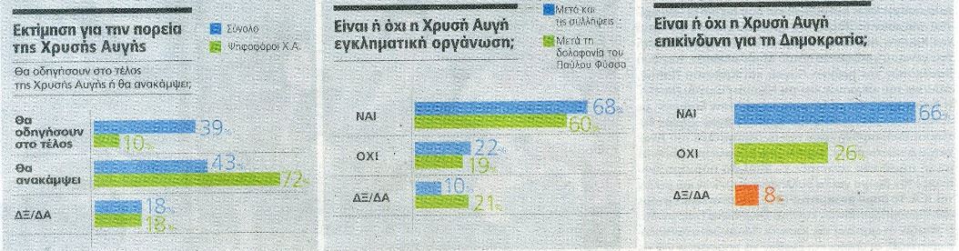 Συντριπτικά είναι τα ποσοστά των ερωτηθέντων που θεωρούν ότι η Χρυσή Αυγή είναι εγκληματική οργάνωση. Ειδικότερα, το 68% των ερωτηθέντων, απαντούν θετικά και μόλις ένα 22% θεωρεί ότι δεν είναι εγκληματική οργάνωση.