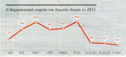 Αντίθετα πτώση εμφανίζει η Χρυσή Αυγή από το 6,7% στο 6,4 %, ενώ είναι χαρακτηριστικό ότι τον Ιούνιο το κόμμα είχε ποσοστό 10.8%.