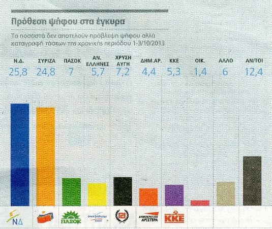 Με αναγωγή επί των εγκύρων στην εκτίμηση πρόθεσης ψήφου, τα ποσοστά των κομμάτων διαμορφώνονται ως εξής: ΝΔ 25,8%, ΣΥΡΙΖΑ 24,8%, Χρυσή Αυγή 7,2%, ΠΑΣΟΚ 7%, ΑΝ.ΕΛ. 5,7%, ΚΚΕ 5,3%, ΔΗΜΑΡ 4,4%.